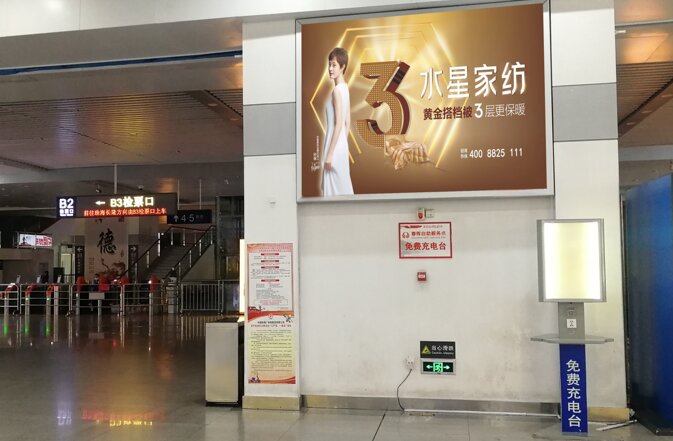 媒体位置/形式:候车大厅南/北面/VIP进站口墙面灯箱 媒体数量:4块 媒体尺寸:2.4m×8.9m=21.36㎡(2块)、2.3m×10.8m=24.84㎡(2块) 媒体报价:10万元/月/块 |
