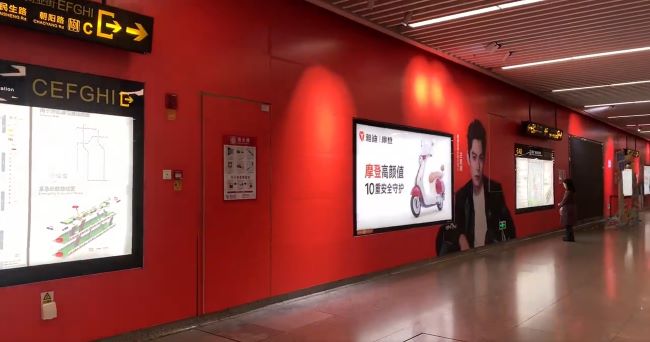 南宁地铁朝阳广场站厅品牌墙广告分布于乘客进入站厅的主要通行路径两侧。无论是非付费区还是付费区,乘客在完成安检、购票或验票流程时,其行进速度相对缓慢,为广告提供了较为充分的视觉接触时间。品牌墙由多块十二封灯箱和整面墙贴连续组合而成,非付费区与付费区的媒体总面积分别达到300m²和335m²。这种大面积的连续画面展示,形成了强烈的视觉冲击力与立体环绕感,有助于品牌形象的突出和统一呈现。