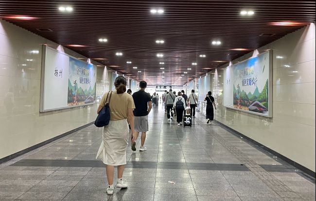 扬州站出站通道是所有抵站旅客离开车站的必经之路,通道两侧的灯箱广告27块灯箱组成阵列,能高效覆盖几乎所有抵达人群,连续发布对行进中的旅客形成持续的视觉影响,增强了品牌展示的阵势和整体冲击力。旅客在出站过程中,步速相对平缓,且通道内环境干扰信息较少。这为广告提供了相对充裕的视觉接触时间,有利于旅客对广告内容的接收与记忆。