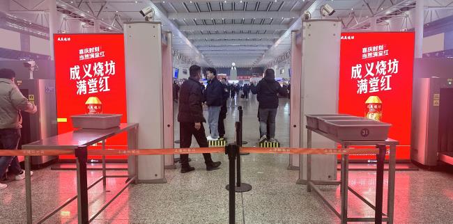 上海虹桥站出发层进站安检口LED屏广告位于旅客安检排队的行进动线旁。在等待和通过安检的过程中,旅客的视线很容易自然地扫过屏幕,确保了广告的高触达率。24面屏幕组成的套装,能对密集的客流形成多角度的视觉覆盖。高频轮播能够充分利用安检前后的碎片化时间,对不同批次的旅客进行反复提示,有助于加深品牌印象。