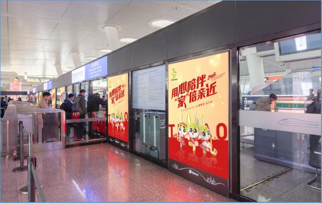 杭州东站出发层进站安检口LED屏广告南北进站口各6面屏幕形成的联排布局,在安检区域构成有效的视觉覆盖网络,对排队区域的旅客形成多角度的视觉影响,增强了品牌形象的展示效果和统一性。安检口正处于旅客进站流程中的关键位置。旅客在排队等候及通过安检时,视线会自然地落在安检机周围的立地竖屏上,这种位置特性确保了广告内容能够直接进入旅客的视野范围,实现近距离的强制触达。