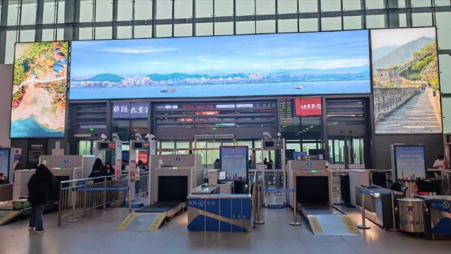台州西站出发进站安检口LED刷屏机广告以立地形式直接置于旅客排队通道的正前方或侧前方,屏幕中心高度与成年人的视线高度相近,形成自然的平行对视关系。这种近距离的展示,消除了观看障碍,使得画面细节清晰可见,视觉冲击力直接,极大提升了广告内容的 阅读率与记忆度。一套3台设备构成的联排联播组合,可以沿着排队区进行布局。这不仅能服务更长的排队队伍,还能通过循环播放的内容形成动态的视觉序列,对排队中的旅客进行重复提示或展示系列信息,强化品牌认知。
