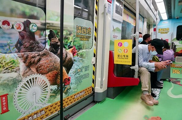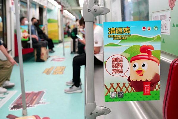 广州地铁3号线“清城区清远鸡”专列广告,每天可装载约3.5万人次,宣传周期内将达约98万人次。列车两侧车门贴广告、车窗贴广告、地板贴广告等配以清远鸡的卡通IP形象与实物图片让车内乘客纷纷拍照打卡。广州地铁车厢广告上的二维码也可以直达购买界面。