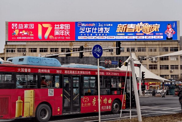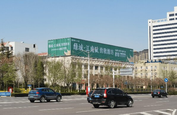 广告优势:媒体位于东风街与北海路路交叉口的西北角楼顶,毗邻潍坊市博物馆、富华游乐场、富华大酒店、市府、银座、新华路佳乐家印象汇、圣荣中百、大润发等,处于潍坊政治经济文化中心和潍坊中部商圈重要位置。其媒体视觉覆盖范围包括东风街以及北海路。