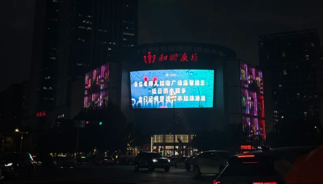 济南和谐广场外墙LED大屏广告独特的弧形设计在建筑立面上形成了独特的视觉张力,不仅与建筑外观更好融合,还能提供更宽广的视角覆盖,在复杂的城市环境中保持强烈的视觉存在感与冲击力。大屏位于商场外墙玻璃幕墙上方高处醒目位置,视野开阔,无遮挡,使广告信息能够远距离清晰辨识,实现了对主干道双向车流及行人的广域覆盖。高频次的播放策略能够对日间不同时段经过的庞大人流和车流进行反复提示,有效利用乘客和驾驶者的碎片化等待时间,强化品牌认知。